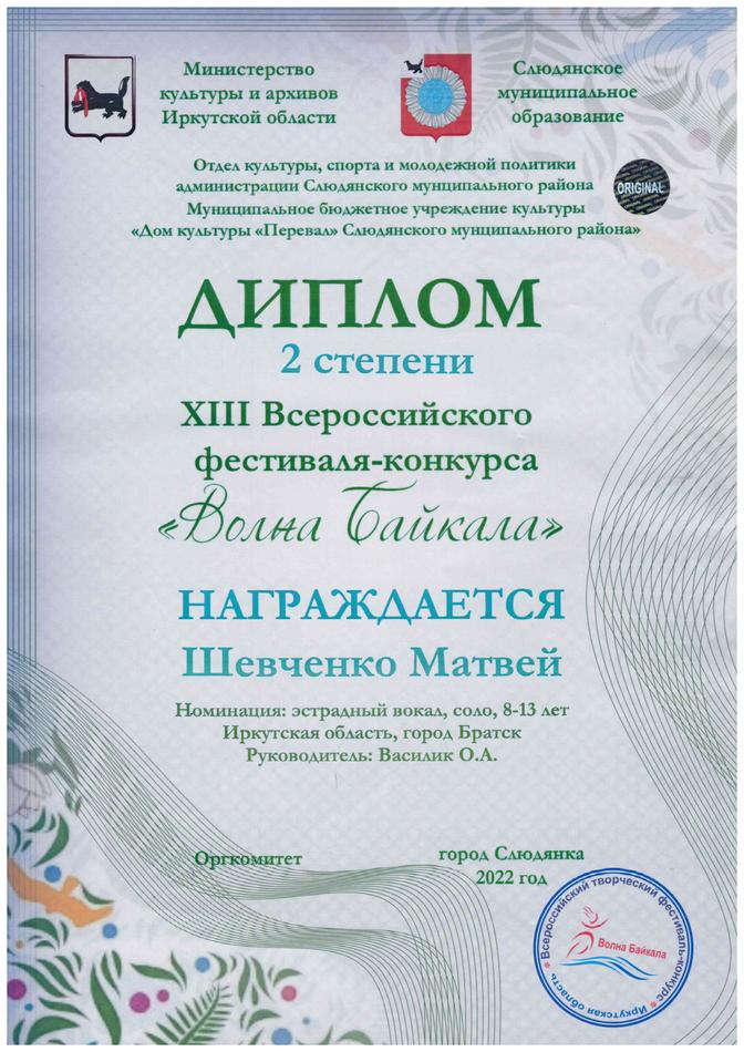 - диплом II степени XIII Всероссийского фестиваля-конкурса «Весна Байкала» в номинации «Эстрадный вокал. Соло», возрастная группа 8-13 лет, г. Слюдянка