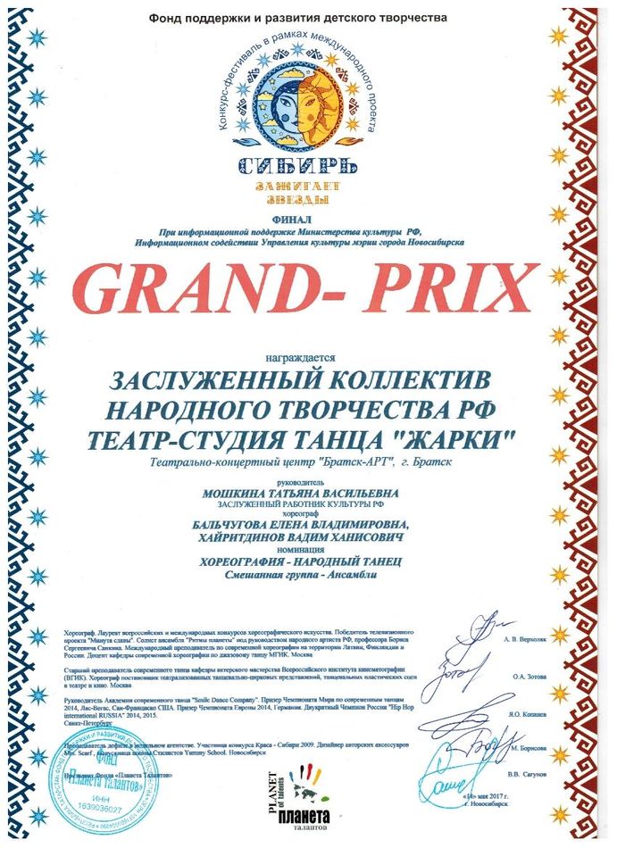 - специальный приз «За сохранение народного колорита в хореографическом творчестве Международного хореографического конкурса «Грани», г. Новосибирск