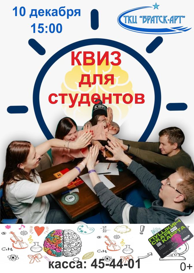 Участникам квиз-клуба в ТКЦ «Братск-АРТ» будет предложен увлекательный способ получения новых знаний и положительных эмоций, развития логики, мышления, памяти, формирования социальных навыков.
