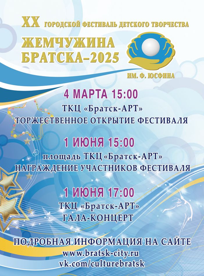 Лучшие номера будут представлены на гала-концерте фестиваля, который пройдёт в День защиты детей — 1 июня на сцене ТКЦ «Братск-АРТ». В рамках концерта состоится церемония награждения дипломантов I, II, III степени и чествование обладателей Гран-при «Жемчужины Братска — 2025».