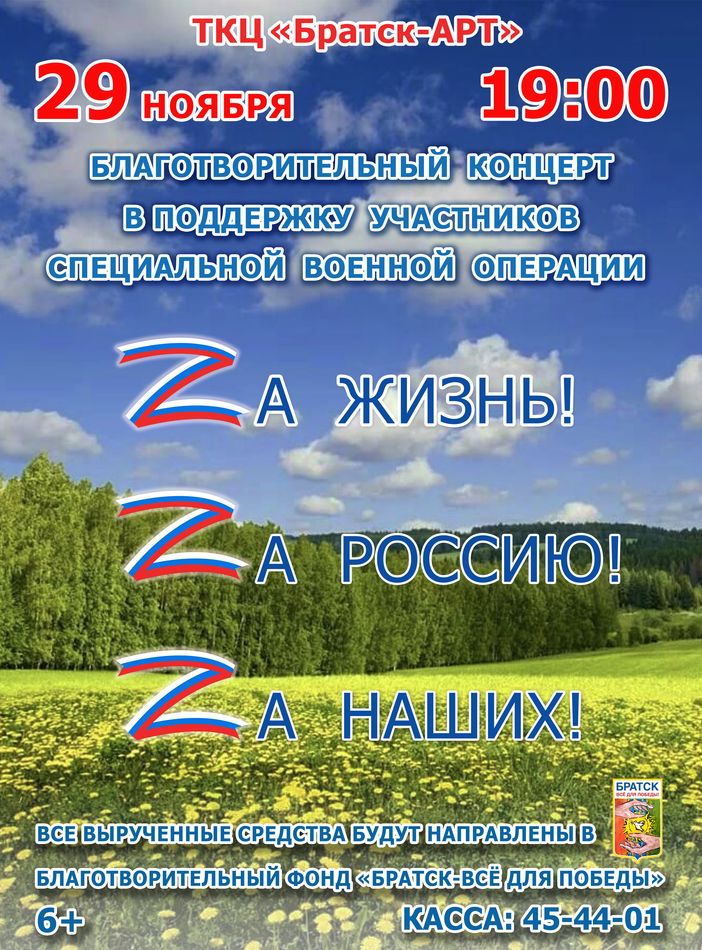 Все собранные средства от продажи билетов будут направлены в благотворительный фонд «Братск - все для победы» и будет использоваться для решения актуальных нужд участников специальной военной операции.