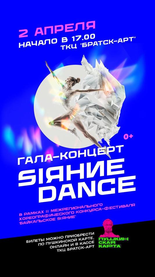 Гала-концерт «SIЯНИЕ DANCE»- завершающий этап II межрегионального хореографического конкурса - фестиваля «Байкальское SIяние», на котором зрители увидят выступление лучших концертных номеров конкурса - фестиваля, церемонию награждения руководителей хореографических коллективов и показ спектакля «ВеРА», автором и хореографом которого является Владимир Лопаев.