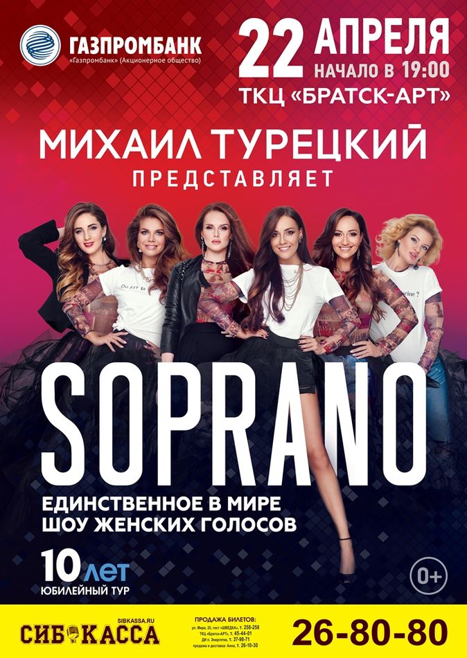 Михаил Турецкий представляет – созвездие женских голосов, SOPRANO. Уникальный вокальный проект, не имеющий аналогов в мире. Все многообразие и богатство существующих в природе голосов: от самого высокого (колоратурное сопрано) до самого низкого (меццо).