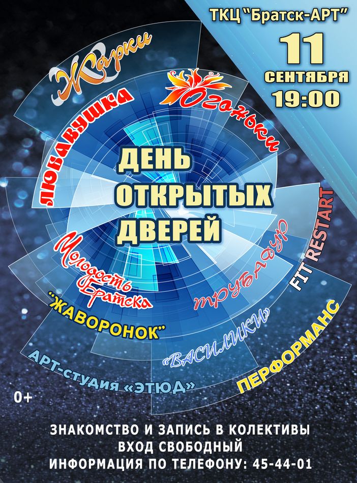 Вас ждет замечательная возможность познакомиться с творчеством коллективов ТКЦ «Братск-АРТ», оценить талант, профессионализм и умение наших замечательных воспитанников!