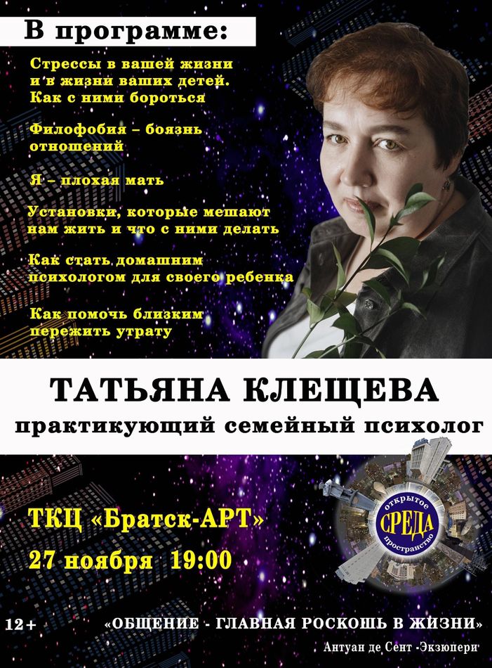 Клуб «Среда!» приглашает на встречу с Татьяной Клещевой — опытным семейным психологом с более чем 25-летним стажем. Татьяна является действительным членом общероссийской профессиональной психотерапевтической лиги, имеет 15-летний опыт преподавания в вузе и обучила свыше 5000 студентов-психологов. Автор более 30 научных публикаций по психологии.