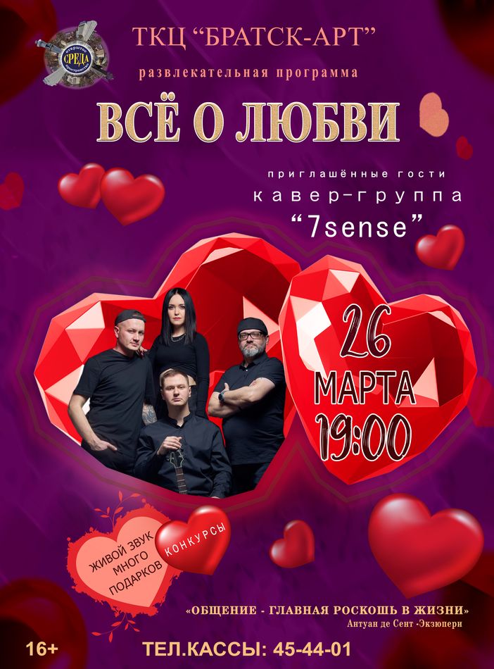 Клуб «Среда» встречает весну! Мы готовим для вас увлекательную весеннюю программу под названием «Все о любви». Специальный подарок для наших гостей — дискотека с кавер-группой «7sense»!
