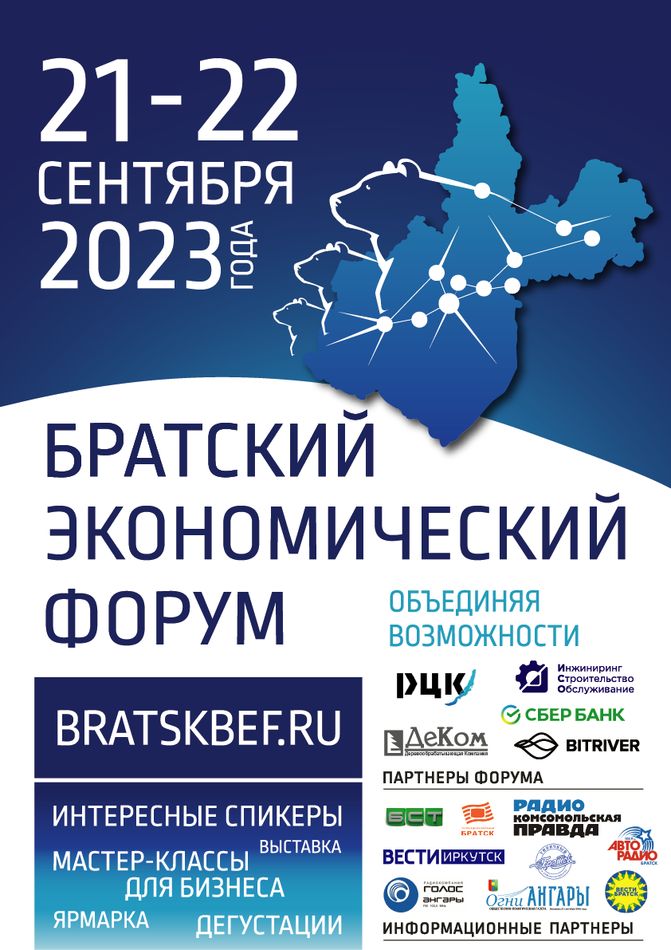 Братский экономический форум - главное событие года в экономической сфере города, а теперь и региона. За прошедшие годы его деловая программа значительно расширилась — бизнес-тренинги, лекции, круглые столы и прочие масштабные мероприятия пользуются большой популярностью среди представителей крупного, малого и среднего бизнеса, поскольку это редкая возможность получить бесценные знания от приглашенных экспертов и даже готовые рецепты успеха, не вкладывая значительных средств. К тому же, участники форума смогут найти новых партнеров, инвесторов, поставщиков и покупателей продукции, наладить сотрудничество, решить многие серьезные вопросы, а также пообщаться с единомышленниками и почерпнуть полезные идеи.