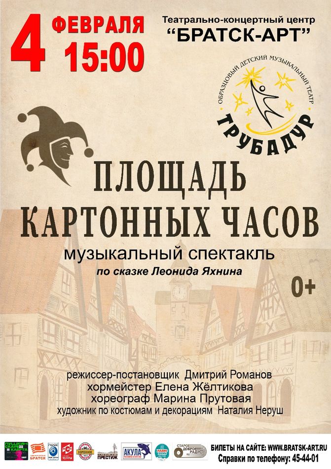 Площадь картонных часов — музыкальный спектакль по сказке Леонида Яхнина. Это история о дружбе, любви и добрых сердцах.