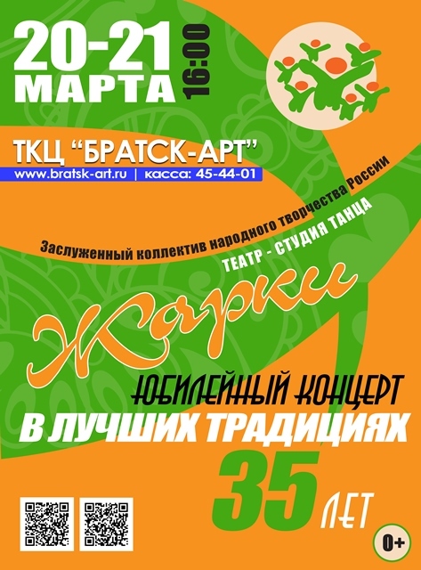 В предстоящие выходные на сцену ТКЦ «Братск-АРТ» выйдут артисты театра-студии танца «Жарки». 20-го и 21 марта в 16:00 заслуженный коллектив народного творчества РФ приглашает братчан на юбилейный концерт, посвященный 35-летию прославленного ансамбля!