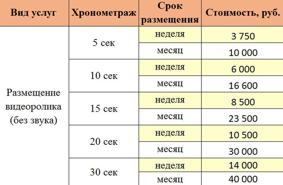 Стоимость услуг по размещению рекламы зависит от длительности видеоролика и периода его размещения.