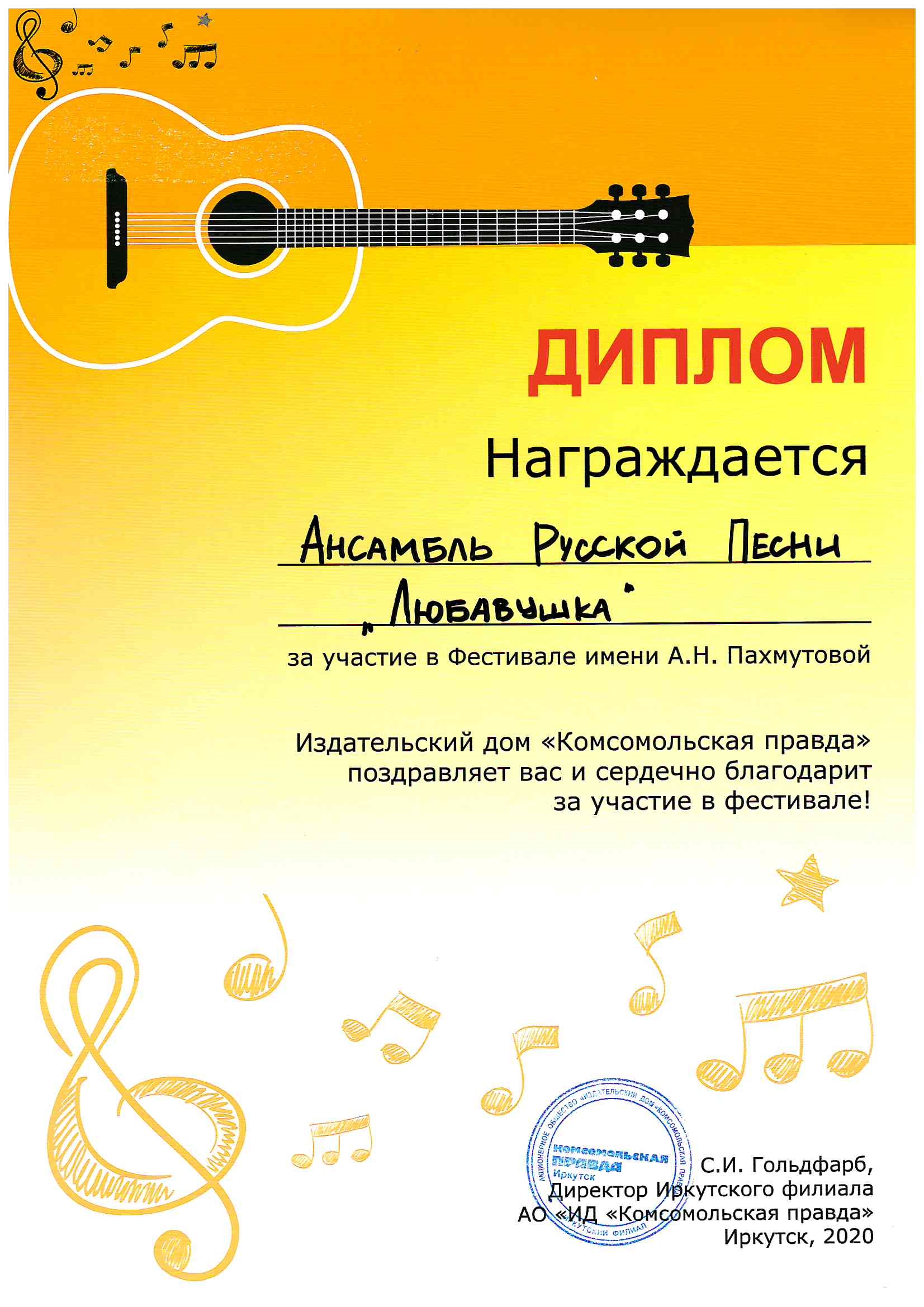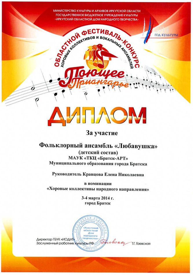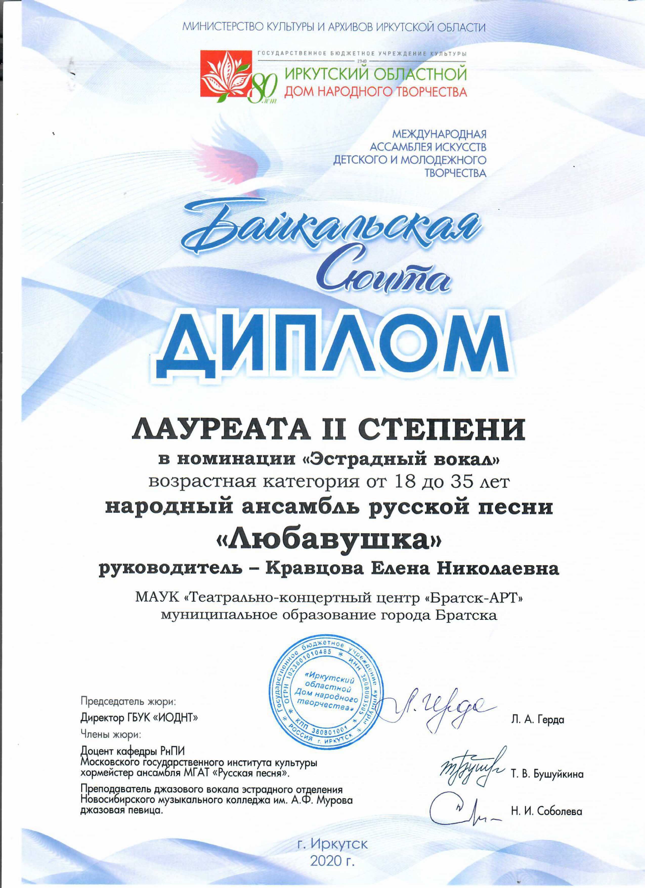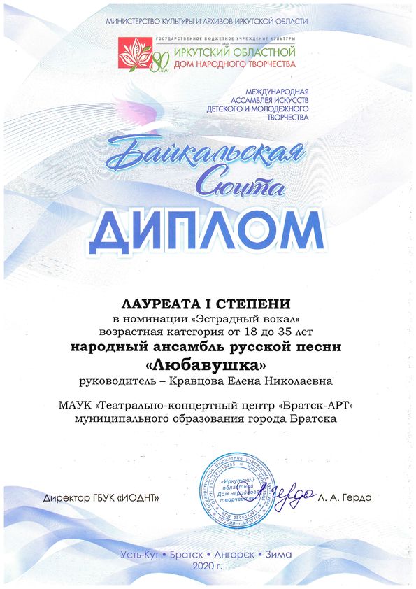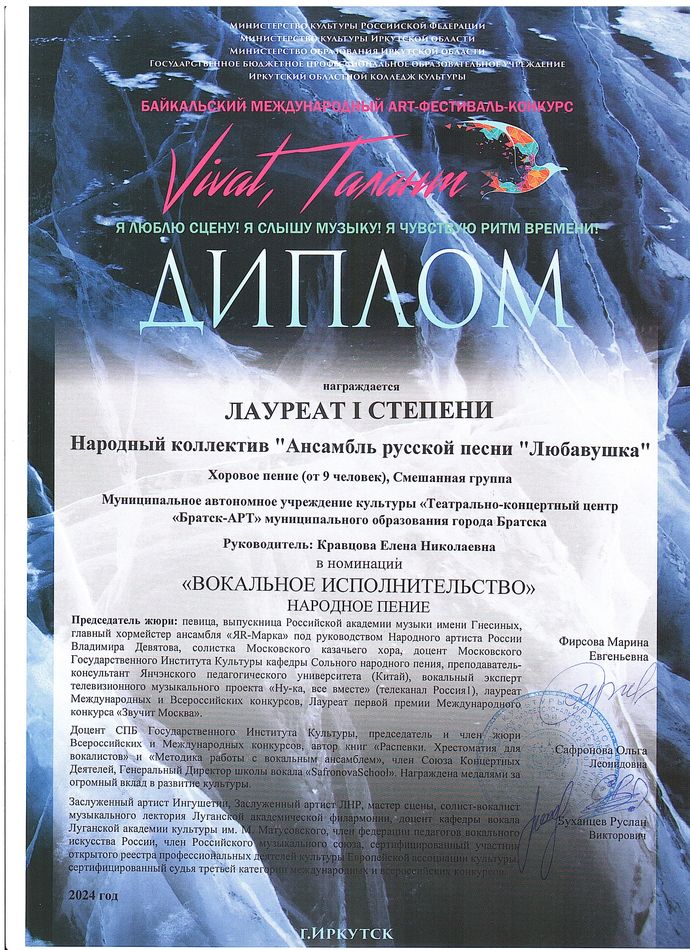 - диплом Лауреата I степени Байкальского международного ART-фестиваля-конкурса «Vivat, талант» в номинации «Вокальное исполнительство. Народное пение», возрастная группа смешанная, г. Иркутск