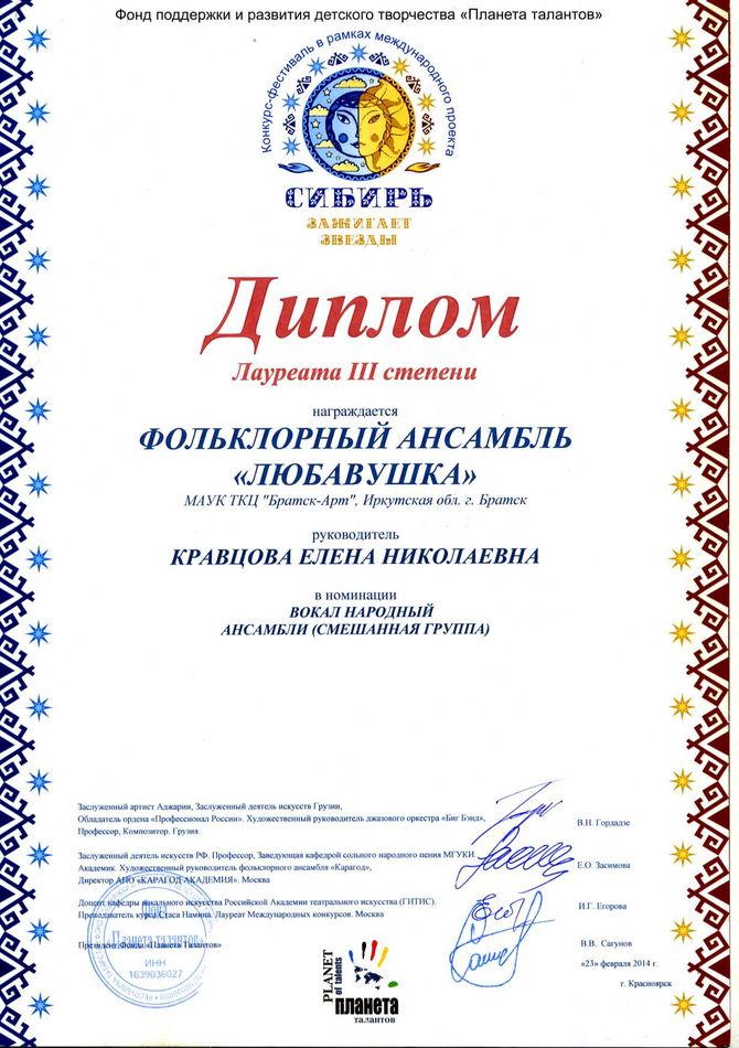 - диплом Лауреата III степени в номинации «Вокал народный. Ансамбли» (смешанная группа) конкурса-фестиваля в рамках Международного проекта «Сибирь зажигает звезды» (г. Красноярск)