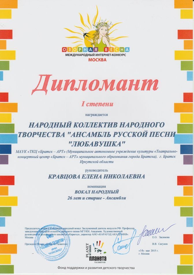 -дипломант I степени в номинации «Вокал народный» Международного интернет-конкурса «Озорная весна» (г. Москва)