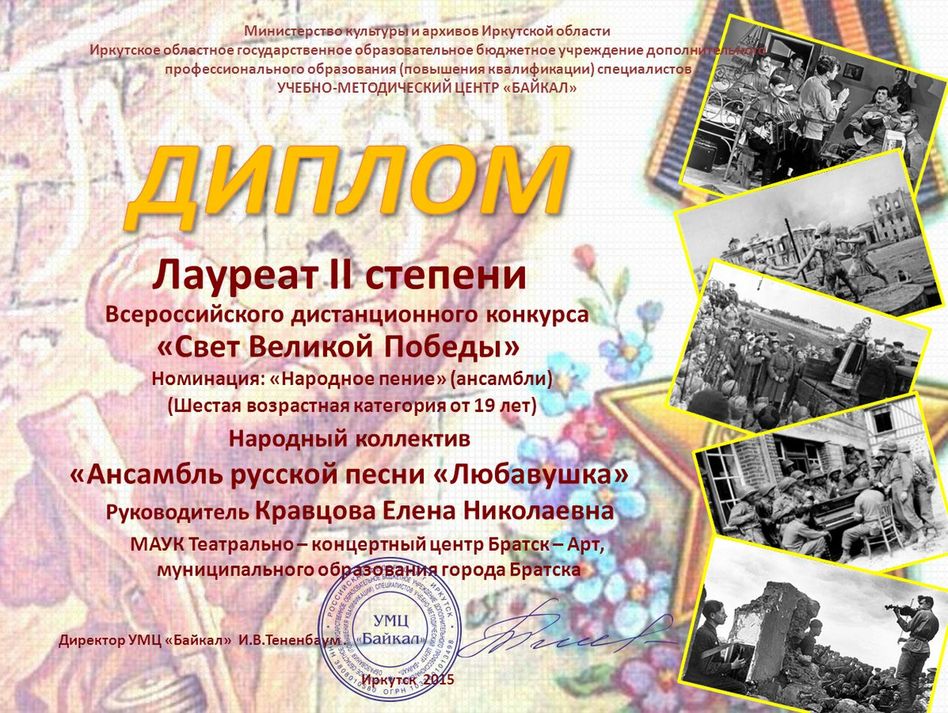 - диплом Лауреата II степени в номинации «Народное пение (ансамбли)» Всероссийского дистанционного конкурса «Свет Великой Победы» (г. Иркутск)