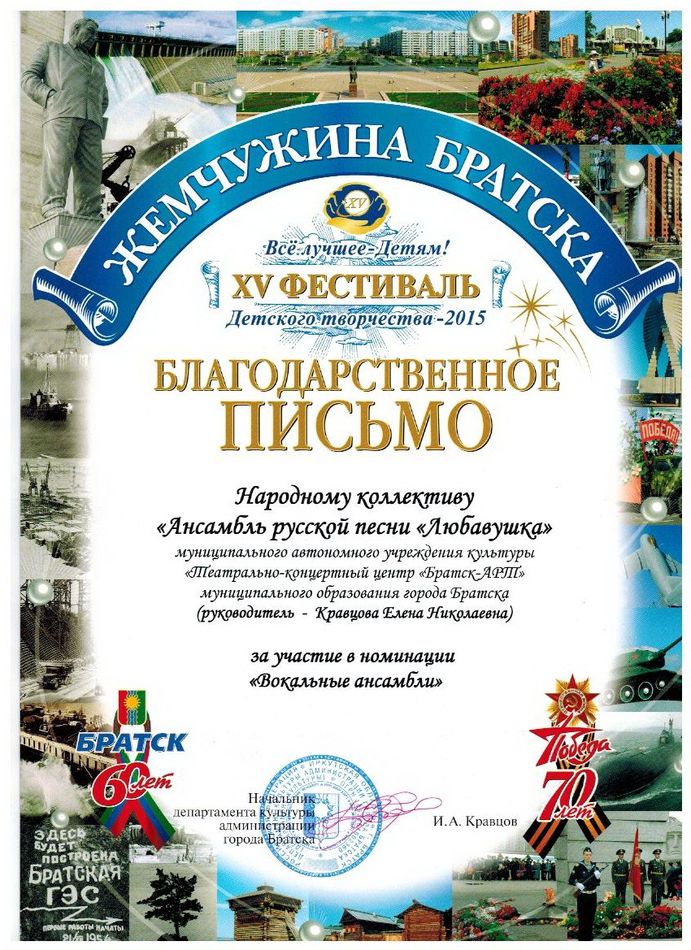 - благодарственное письмо за участие в номинации «Вокальные ансамбли» XV городского фестиваля детского творчества «Жемчужина Братска» (г. Братск)