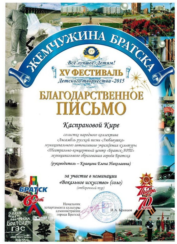 - благодарственное письмо за участие в номинации «Вокальное искусство (соло)» XV городского фестиваля детского творчества «Жемчужина Братска» (г. Братск)