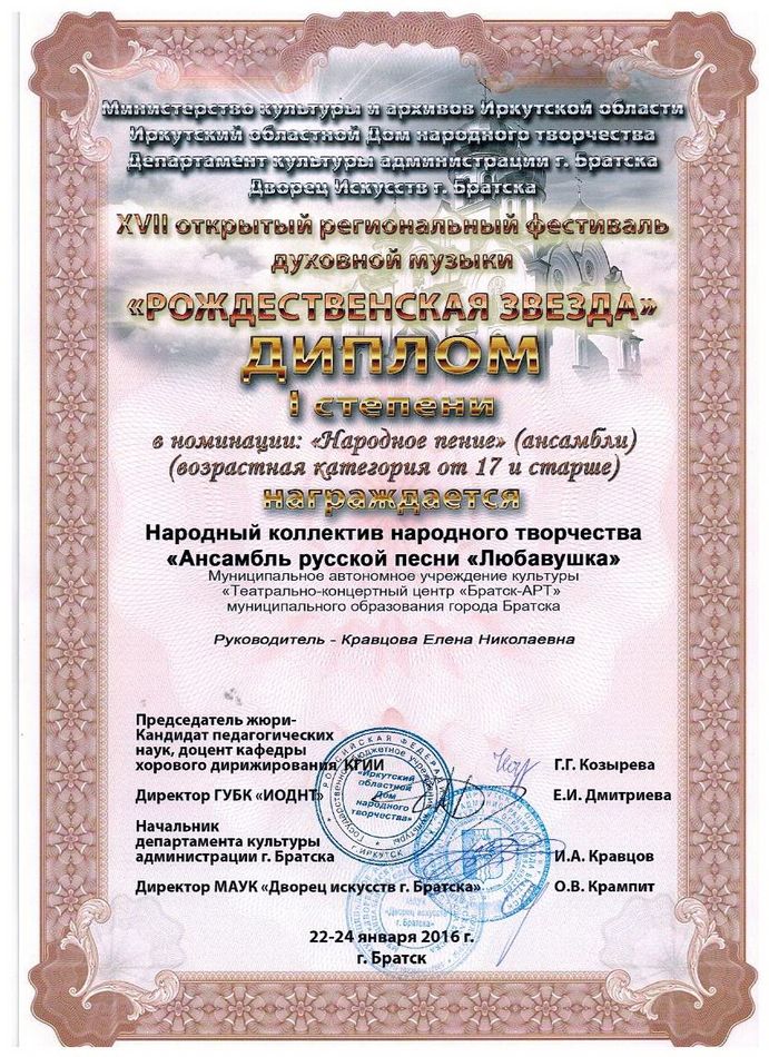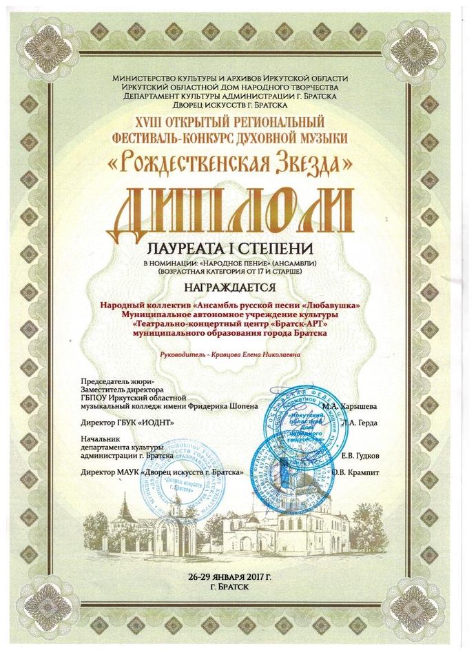 - диплом Лауреата I степени за участие в номинации «Народное пение (ансамбли)» XVII открытого регионального фестиваля духовной музыки «Рождественская звезда» (г. Братск)