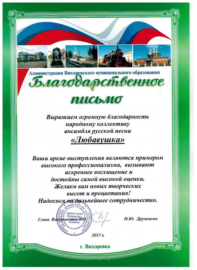 - благодарственное письмо администрации Вихоревского муниципального образования