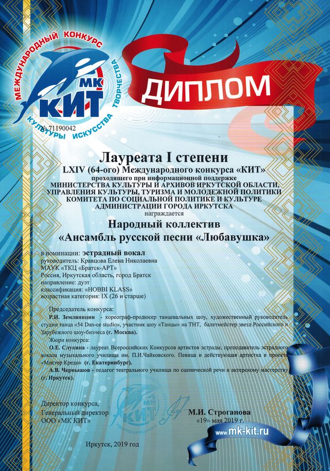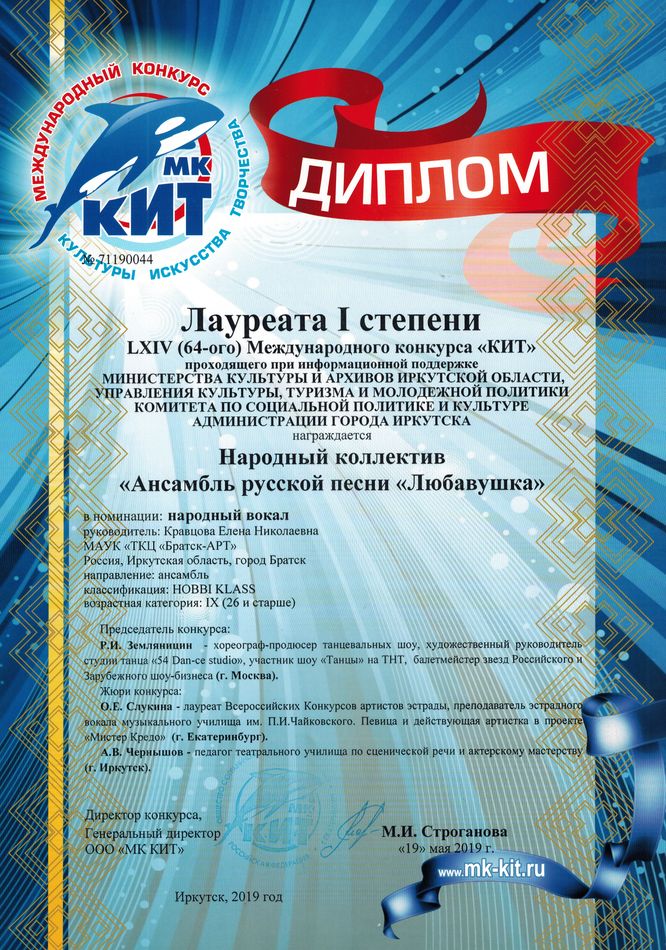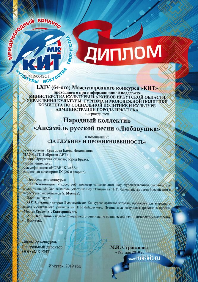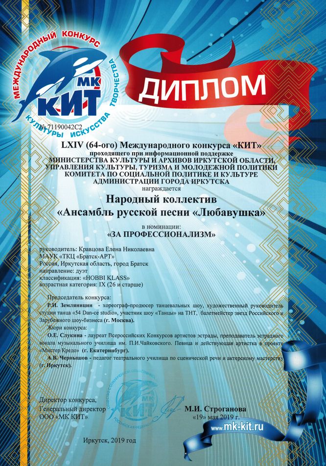 - диплом Лауреата I степени за участие в номинации «Народный вокал (ансамбль)» LXIV Международного конкурса «КИТ» (г. Иркутск)