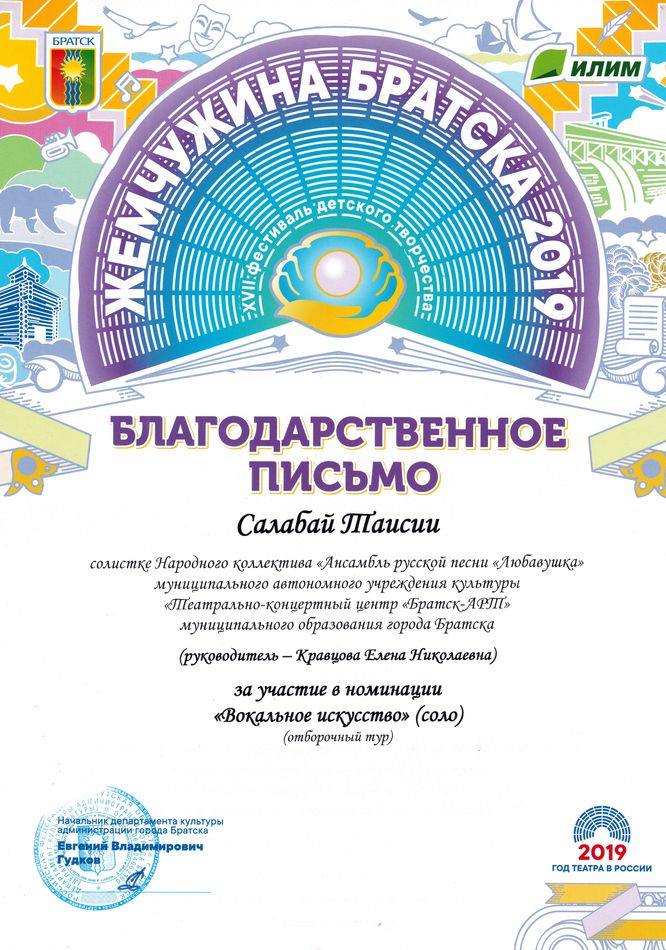 - благодарственное письмо за участие в номинации «Вокальное искусство (соло)» XVII городского фестиваля детского творчества «Жемчужина Братска» (г. Братск)