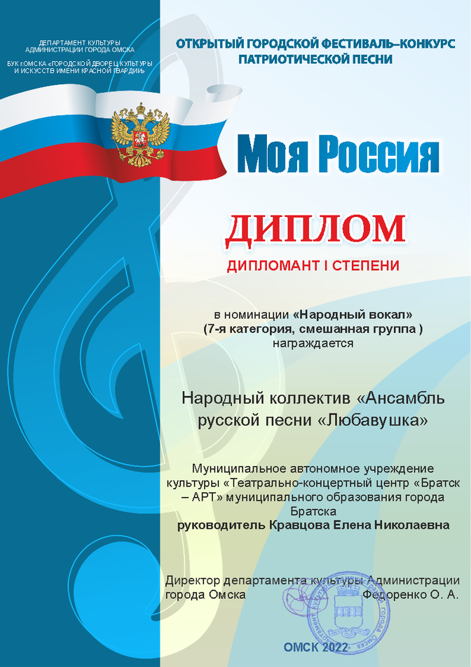 - диплом Дипломанта I степени открытого городского фестиваля-конкурса патриотической песни «Моя Россия» в номинации «Народный вокал», возрастная группа смешанная, г. Омск