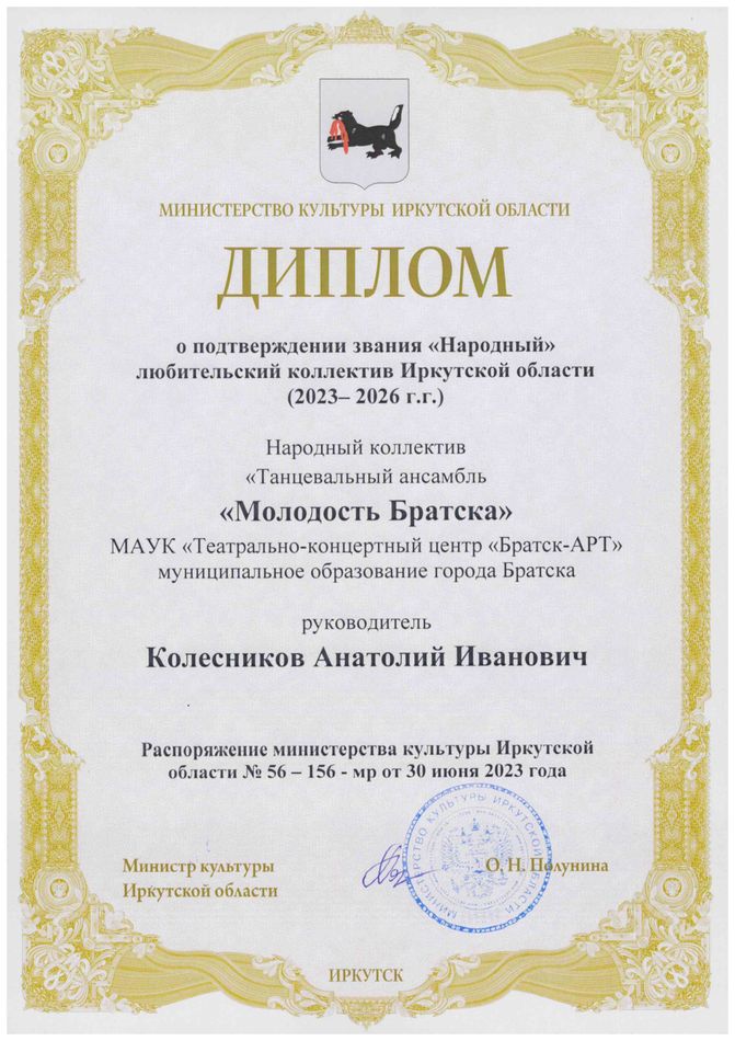 Полное название коллектива: Народный коллектив «Танцевальный ансамбль «Молодость Братска»