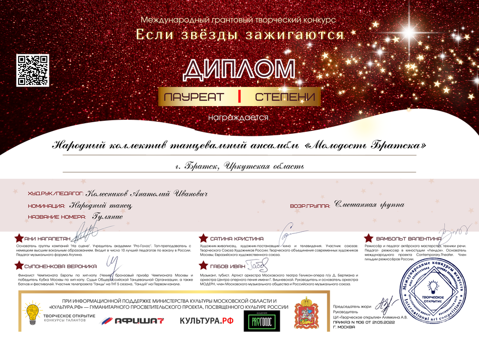 - диплом Лауреата I степени Международного грантового творческого конкурса «Если звезды зажигаются» в номинации «Народный танец», возрастная группа смешанная, г. Москва