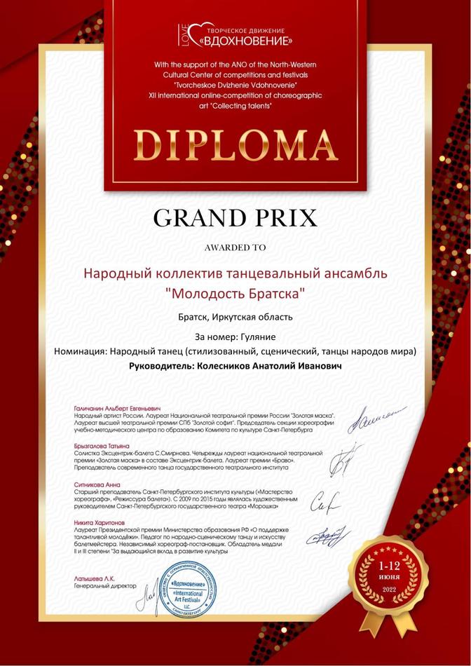 - диплом Гран-При XII Международного онлайн-конкурса хореографического искусства "Collecting talents", г. Санкт-Петербург