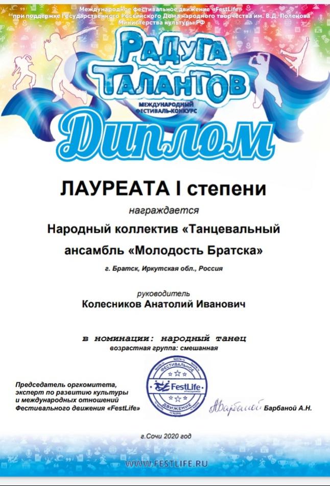 - диплом Лауреата I степени Международного фестиваля-конкурса «Радуга талантов» в номинации «Народный танец», возрастная группа смешанная, г. Сочи