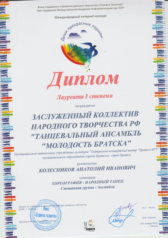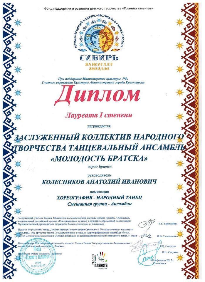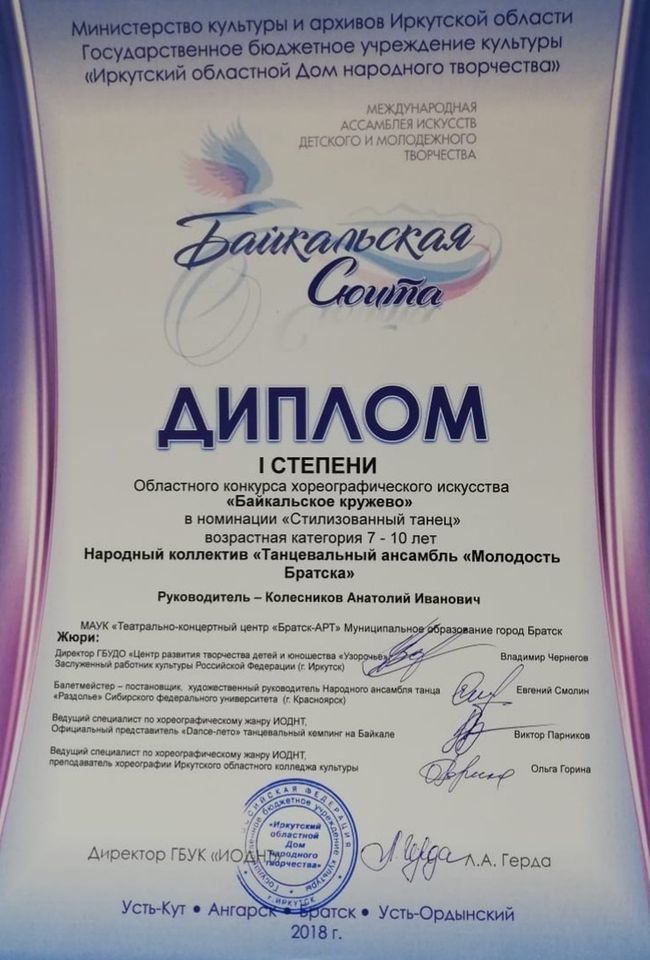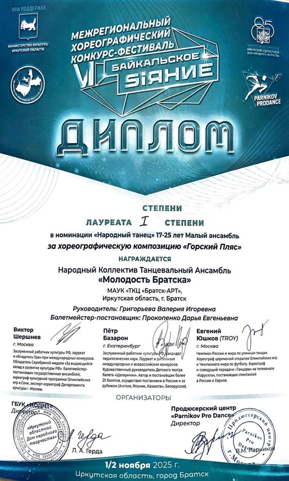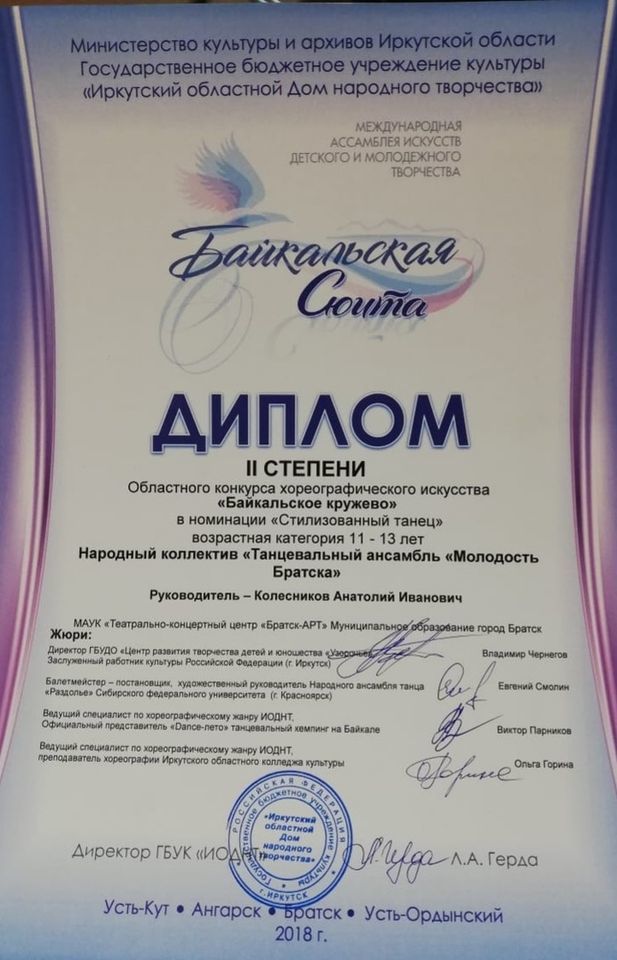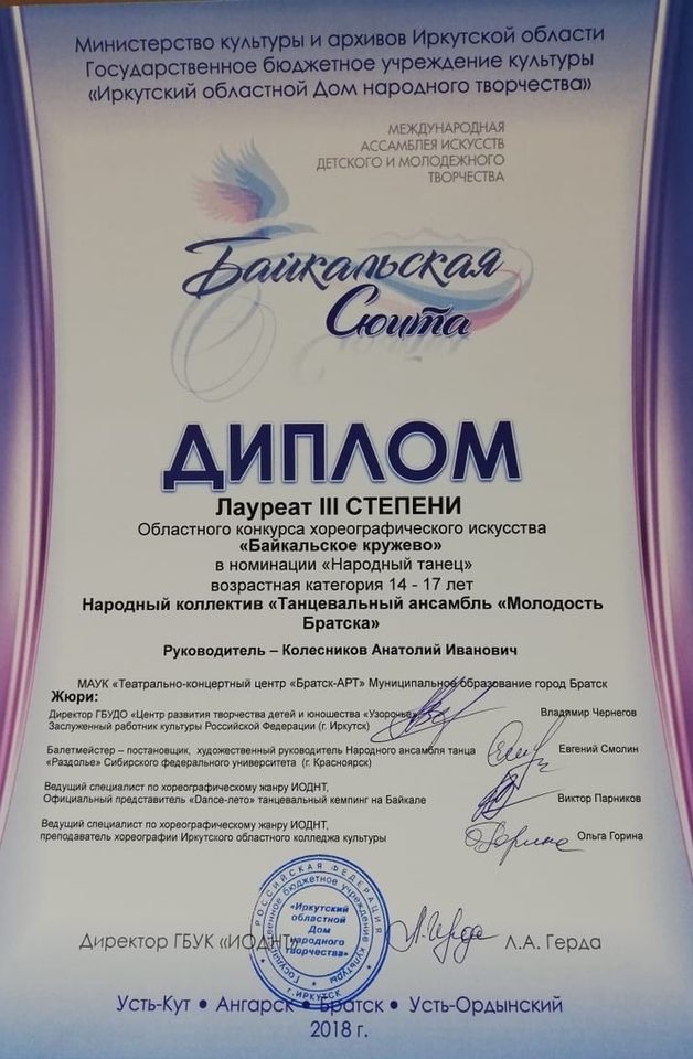 - Диплом Лауреата I степени VI Межрегионального хореографического конкурса-фестиваля «Байкальское Siяние» в номинации «Народный танец», возрастная группа 17-25 лет (номер «Горский пляс»), г. Братск