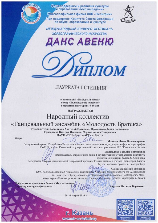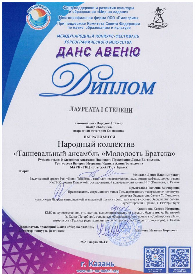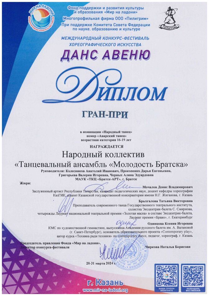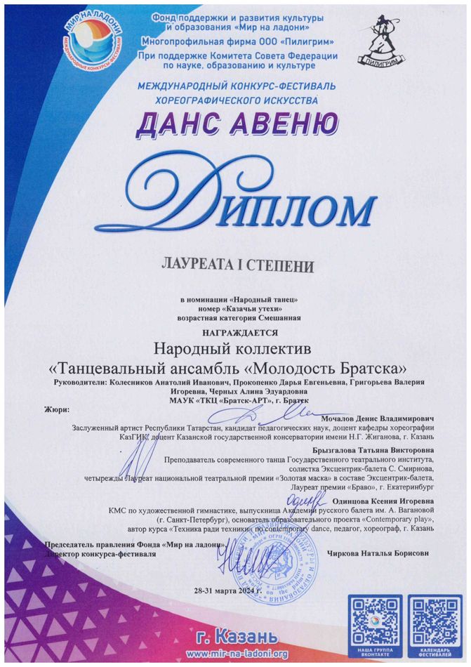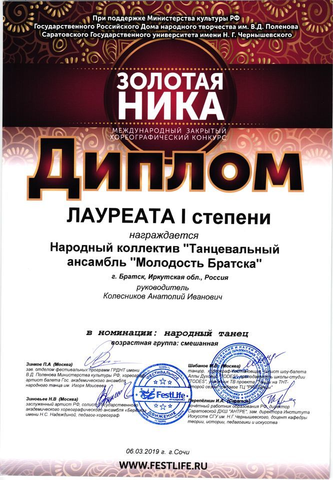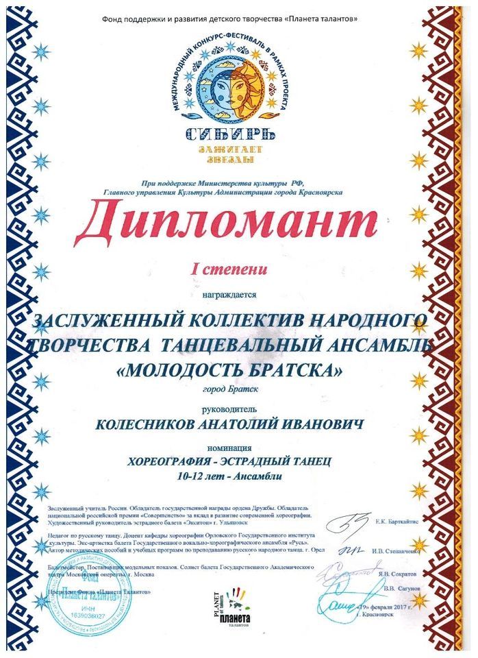 - Диплом Лауреата I степени VI Межрегионального хореографического конкурса-фестиваля «Байкальское Siяние» в номинации «Народный танец», возрастная группа 17-25 лет (номер «Горский пляс»), г. Братск