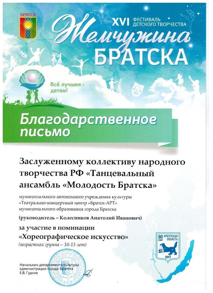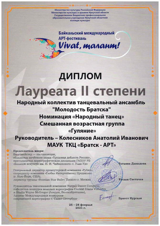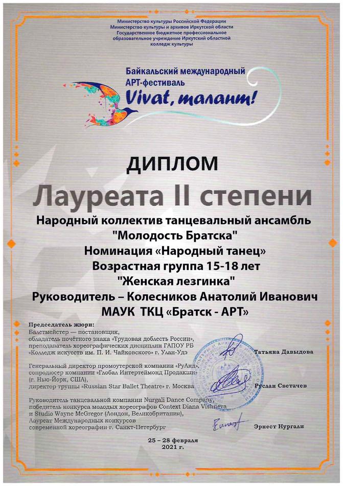 - диплом Лауреата II степени Байкальского Международного АРТ-фестиваля «Vivat, талант!» в номинации «Народный танец», возрастная группа 15-18 лет, г. Иркутск