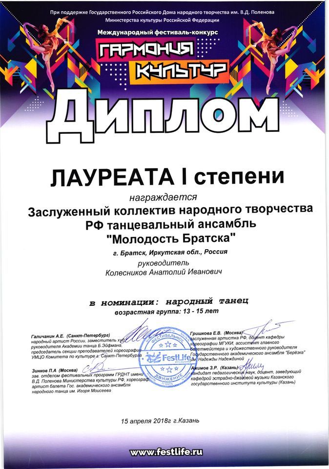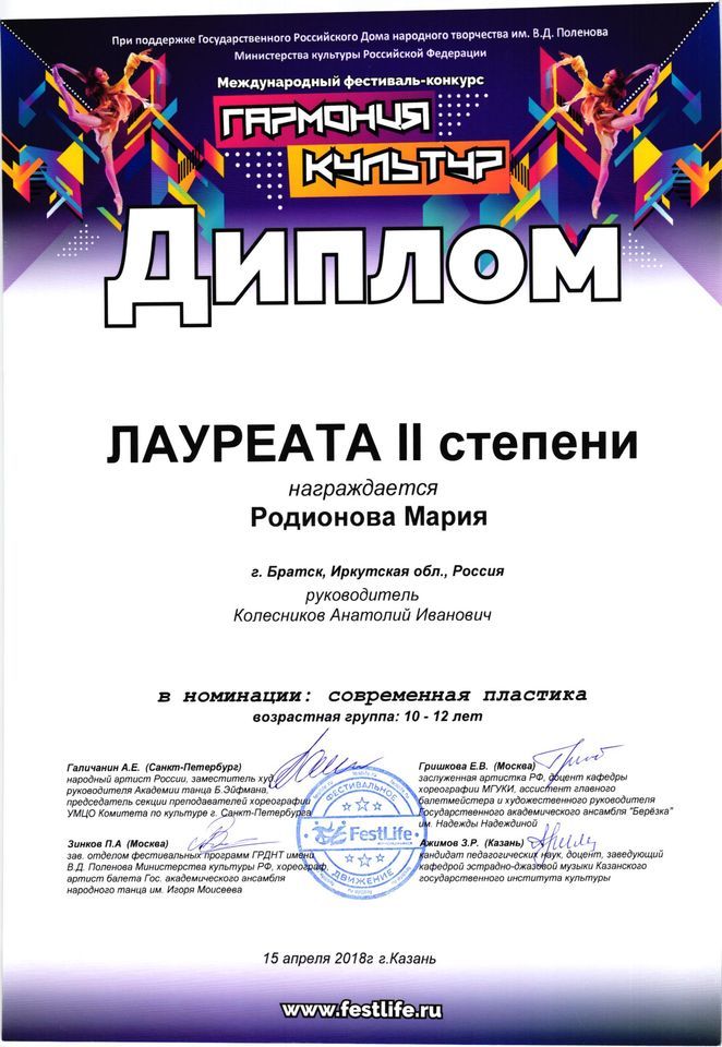 - диплом Лауреата II степени в номинации «Современная пластика» (10-12 лет), диплом Лауреата I степени в номинации «Народный танец» (13-15 лет), диплом Лауреата I степени в номинации «Народный танец» (смешанная группа) Международного фестиваля-конкурса «Гармония культур» (г. Казань)