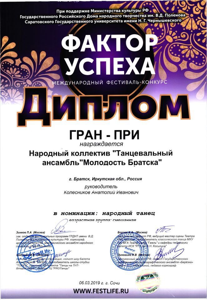 - диплом Гран-при в номинации «Народный танец» (возрастная группа смешанная), диплом Лауреата I степени в номинации «Народный танец» (возрастная группа смешанная) Международного фестиваля-конкурса «Фактор успеха» (г. Сочи)