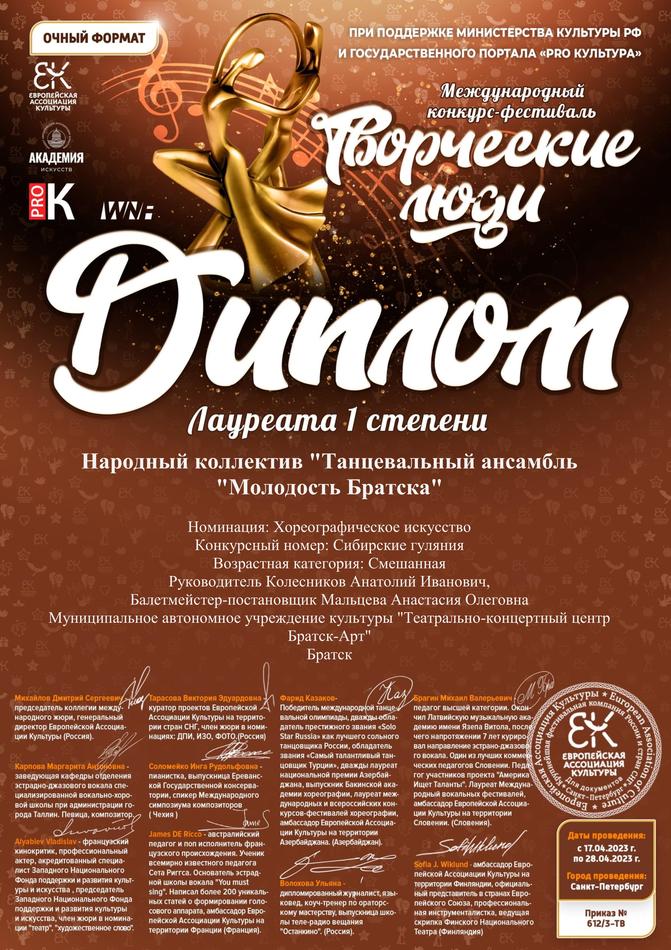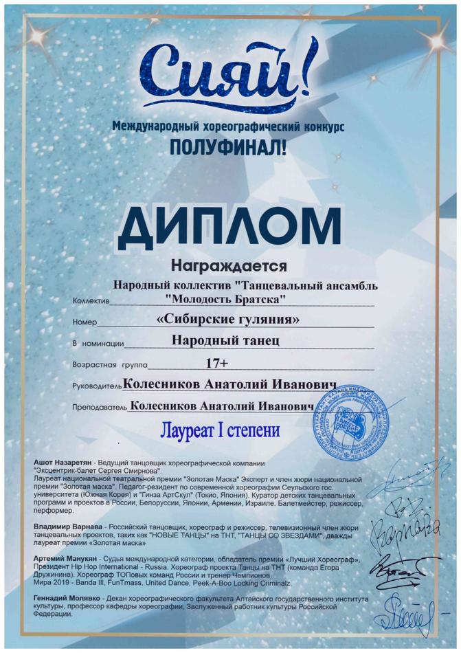 - диплом Лауреата I степени Международного хореографического конкурса «Сияй!» в номинации «Народный танец», возрастная группа 17+ (номер «Сибирские гуляния»), г. Новосибирск
