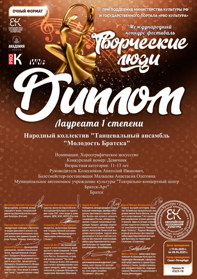- диплом I степени Международного конкурса-фестиваля «Творческие люди» в номинации «Хореографическое искусство» («Калинка»), возрастная группа смешанная, г. Санкт-Петербург