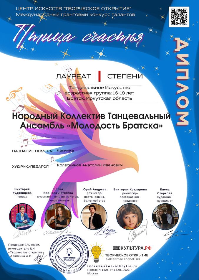 - диплом Лауреата I степени Международного грантового конкурса талантов «Птица счастья» в номинации «Танцевальное искусство», возрастная группа 16-18 лет, г. Москва
