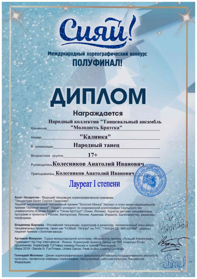 - диплом Лауреата I степени Международного хореографического конкурса «Сияй!» в номинации «Народный танец», возрастная группа 17+ (номер «Калинка»), г. Новосибирск