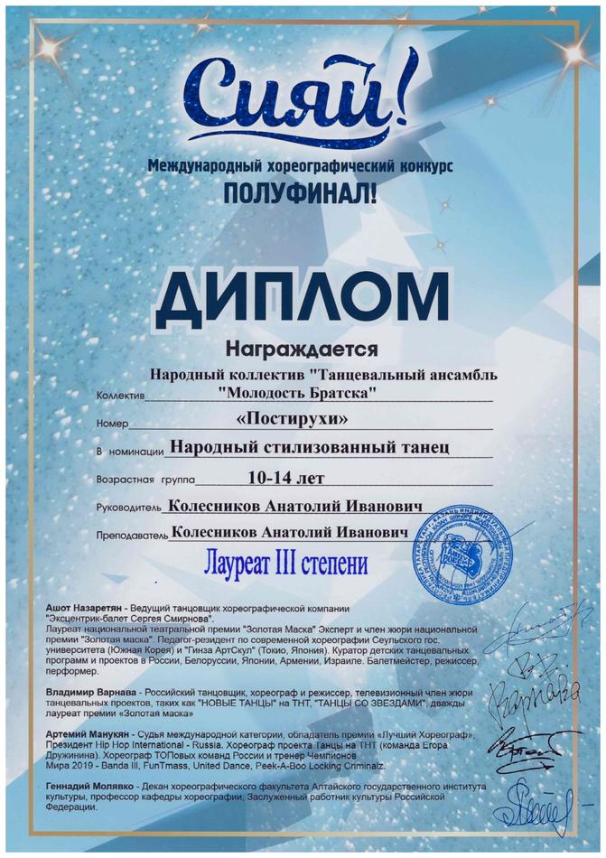 - диплом Лауреата III степени Международного хореографического конкурса «Сияй!» в номинации «Народно-стилизованный танец», возрастная группа 10-14 лет (номер «Постирухи»), г. Новосибирск