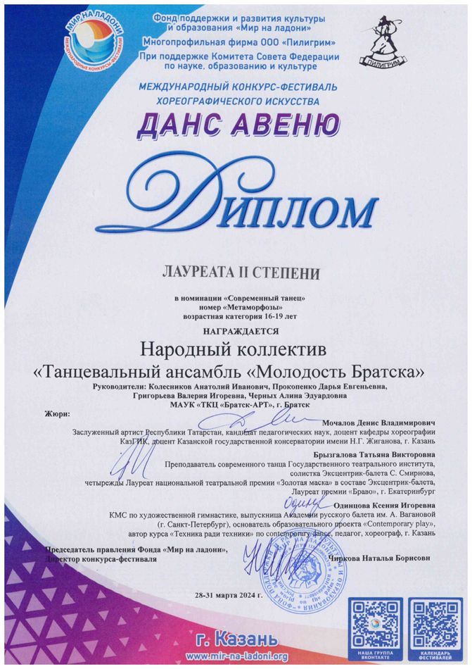 - диплом Лауреата II степени Международного конкурса-фестиваля хореографического искусства «Данс авеню» в номинации «Народный танец», возрастная группа 16-19 (номер «Метаморфозы»
