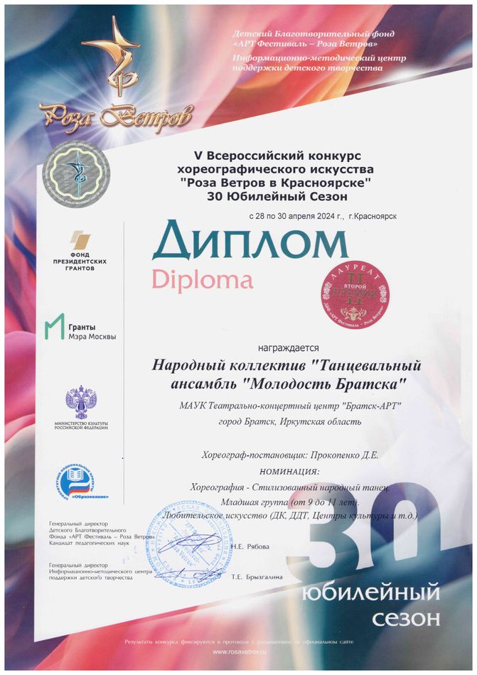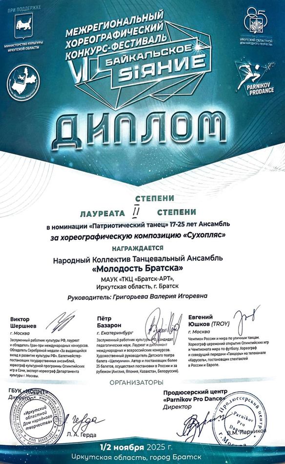 - Диплом Лауреата II степени VI Межрегионального хореографического конкурса-фестиваля «Байкальское Siяние» в номинации «Патриотический танец», возрастная группа 17-25 лет (номер «Сухопляс»), г. Братск