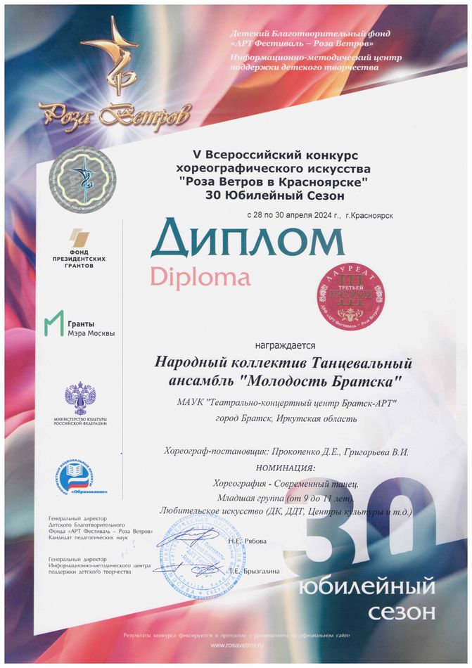 - диплом Лауреата III премии V Всероссийского конкурса любительских театральных коллективов и чтецов «Роза ветров» в номинации «Хореография – Современный танец», возрастная категория до 9-11 лет, г. Красноярск