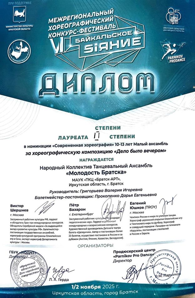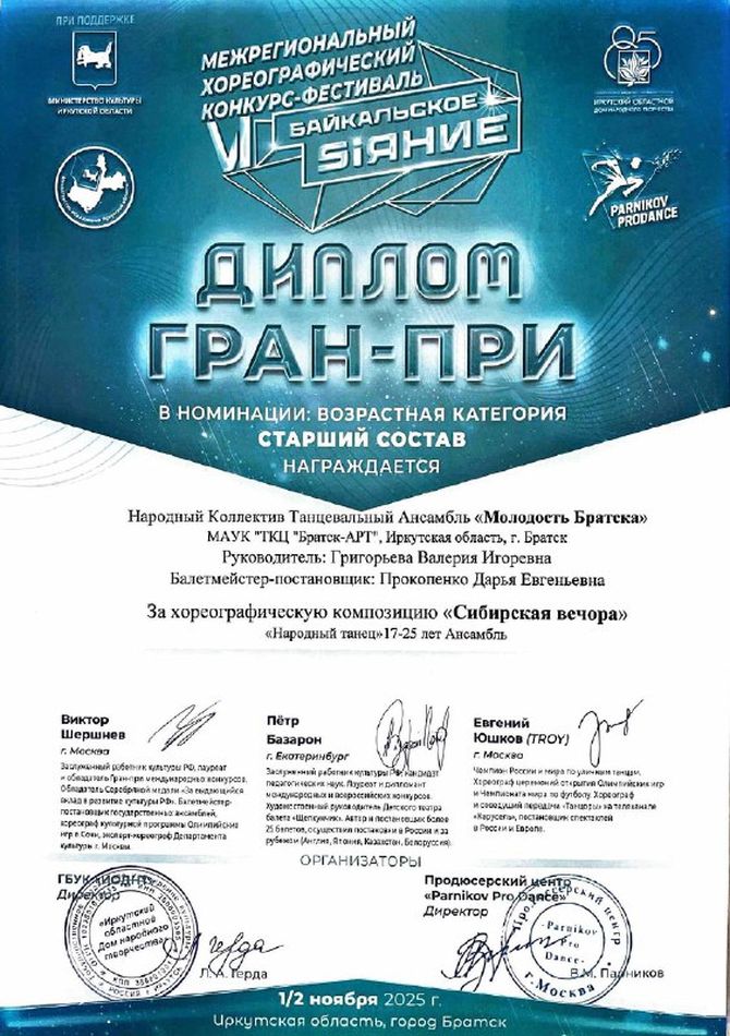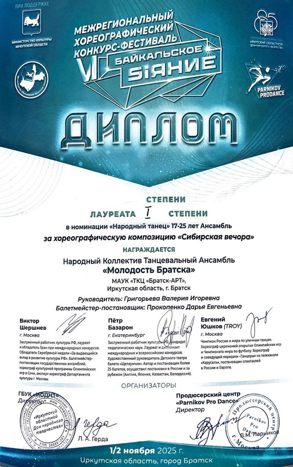 - Диплом Лауреата I степени VI Межрегионального хореографического конкурса-фестиваля «Байкальское Siяние» в номинации «Народный танец», возрастная группа 17-25 лет (номер «Сибирская вечора»), г. Братск