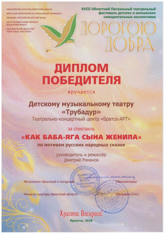 - диплом Победителя XVIII Областного Пасхального театрального фестиваля детских и юношеских самодеятельных коллективов «Дорогою добра» за спектакль «Как Баба-Яга сына женила», г. Иркутск