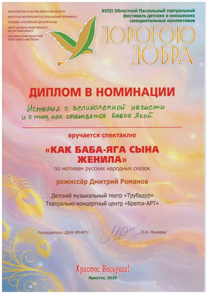 - диплом спектаклю «Как Баба-Яга сына женила» XVIII Областного Пасхального театрального фестиваля детских и юношеских самодеятельных коллективов «Дорогою добра» в номинации «История о великолепной нечисти и о том, как становятся Бабой-Ягой», г. Иркутск
