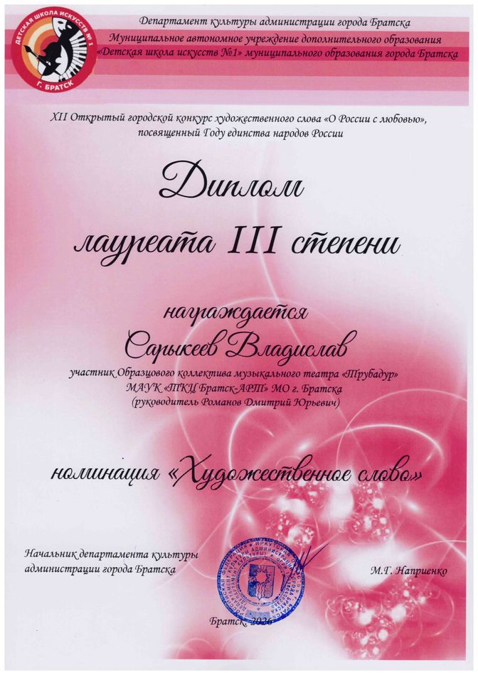 - диплом Лауреата III степени XII Открытого городского конкурса художественного слова «О России с любовью», посвященного Году единства народов России в номинации «Художественное слово» (Сарыкеев Владислав), г. Братск