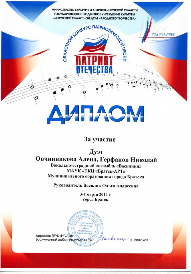 - диплом за участие в номинации «Дуэт» областного конкурса патриотической песни «Патриот Отечества» (г. Братск)