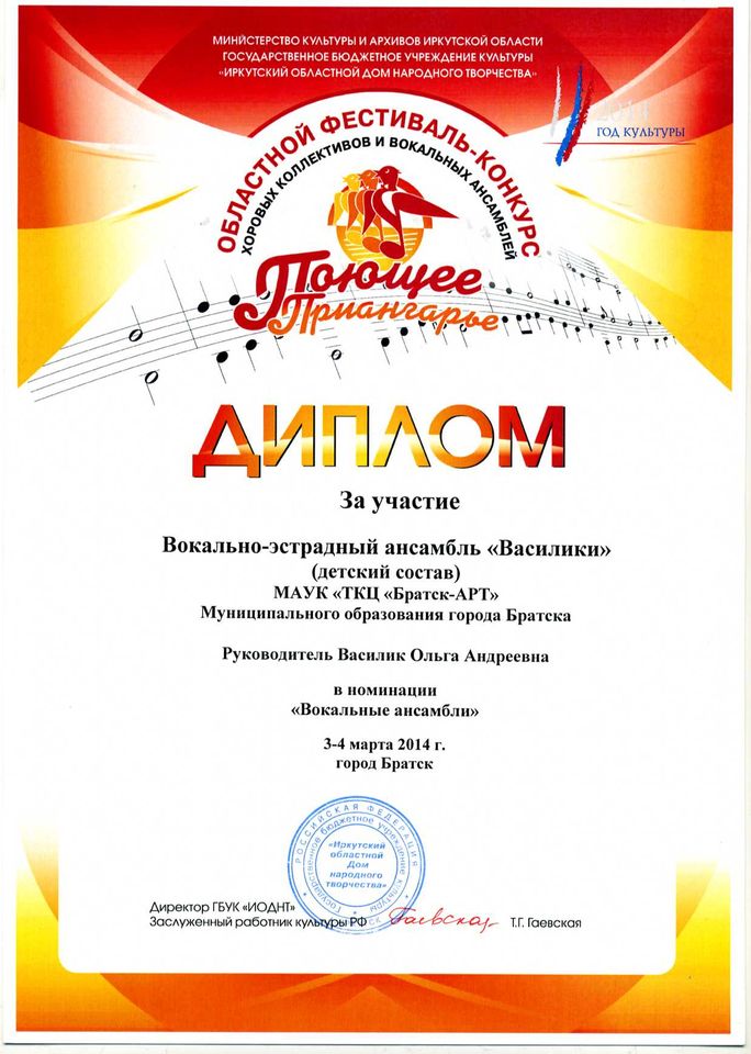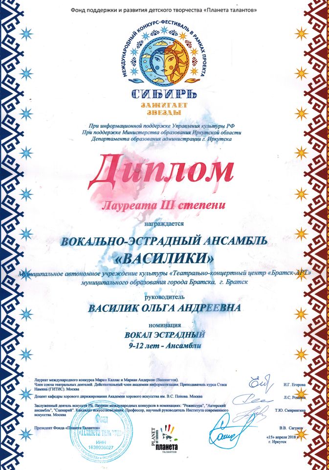 - диплом за участие в номинации «Вокальные ансамбли (детский состав)» областного фестиваля-конкурса хоровых коллективов и вокальных ансамблей «Поющее Приангарье» (г. Братск)