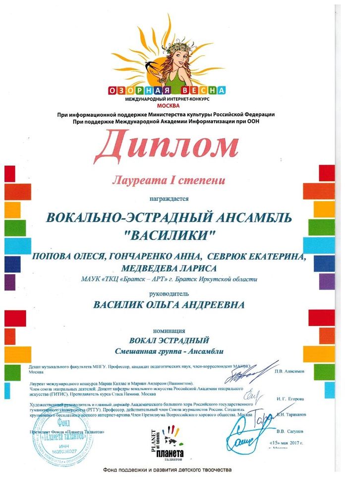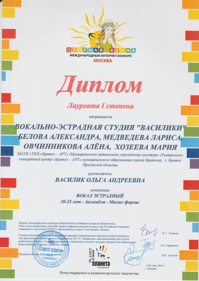 - диплом Лауреата I степени за участие в номинации «Вокал эстрадный (ансамбли)» Международного интернет-конкурса «Озорная весна» (г. Москва)