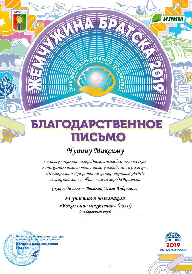 - благодарственное письмо за участие в номинации «Вокальное искусство (соло)» XVII городского фестиваля детского творчества «Жемчужина Братска» (г. Братск)